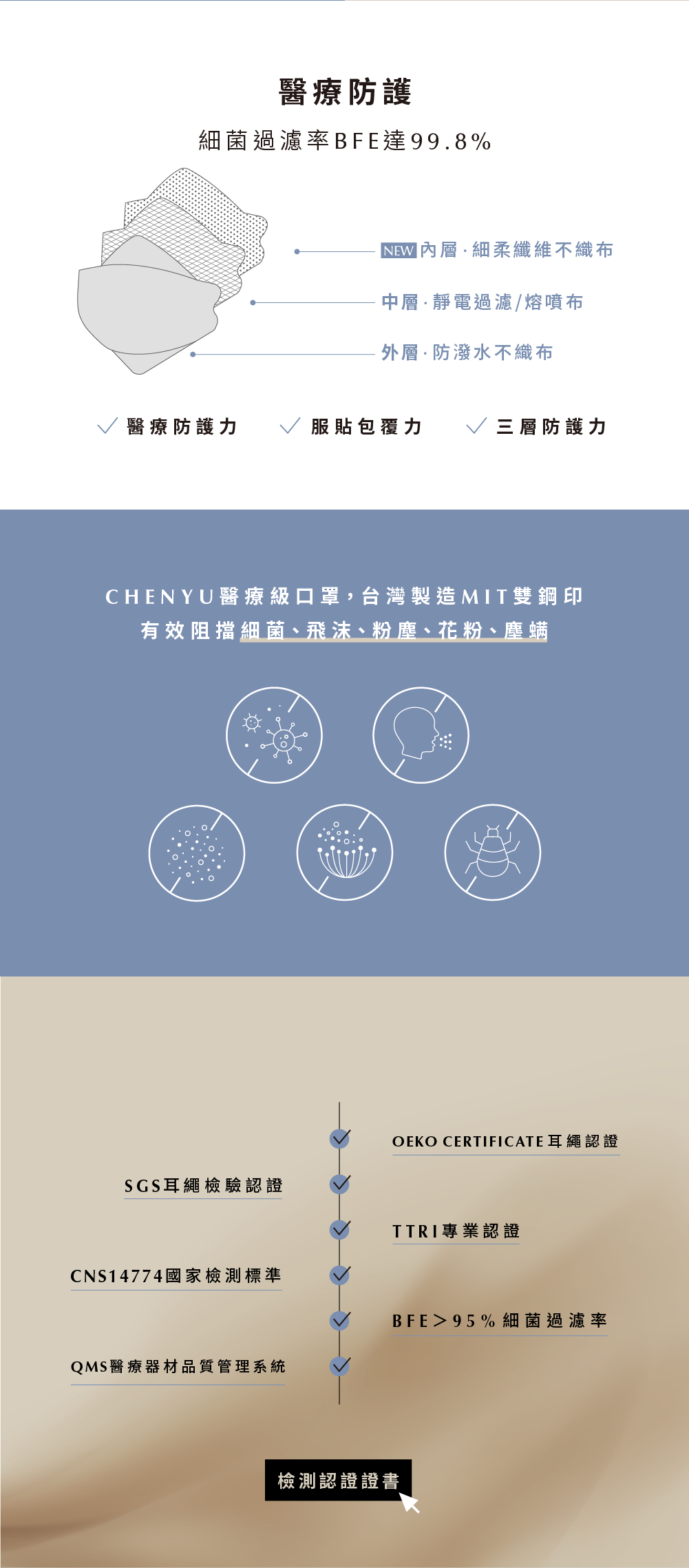 ●主要成分或材料∣內層‧細柔纖維複合不織布、中層‧靜電過濾/熔噴不織布、外層‧防潑水PP不織布