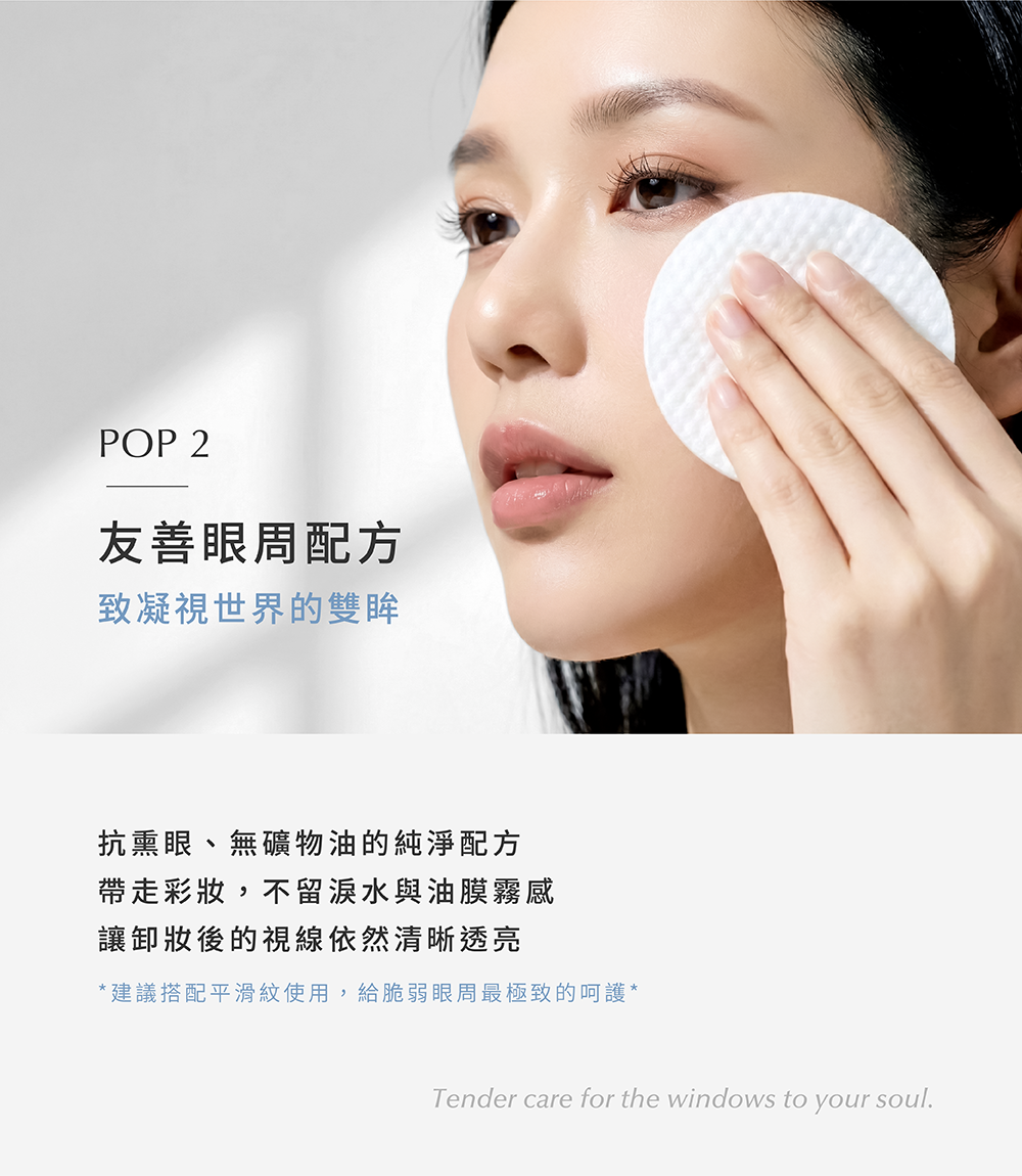 3.平滑面:濕敷於眼唇,再擦拭卸除局部重點彩妝。