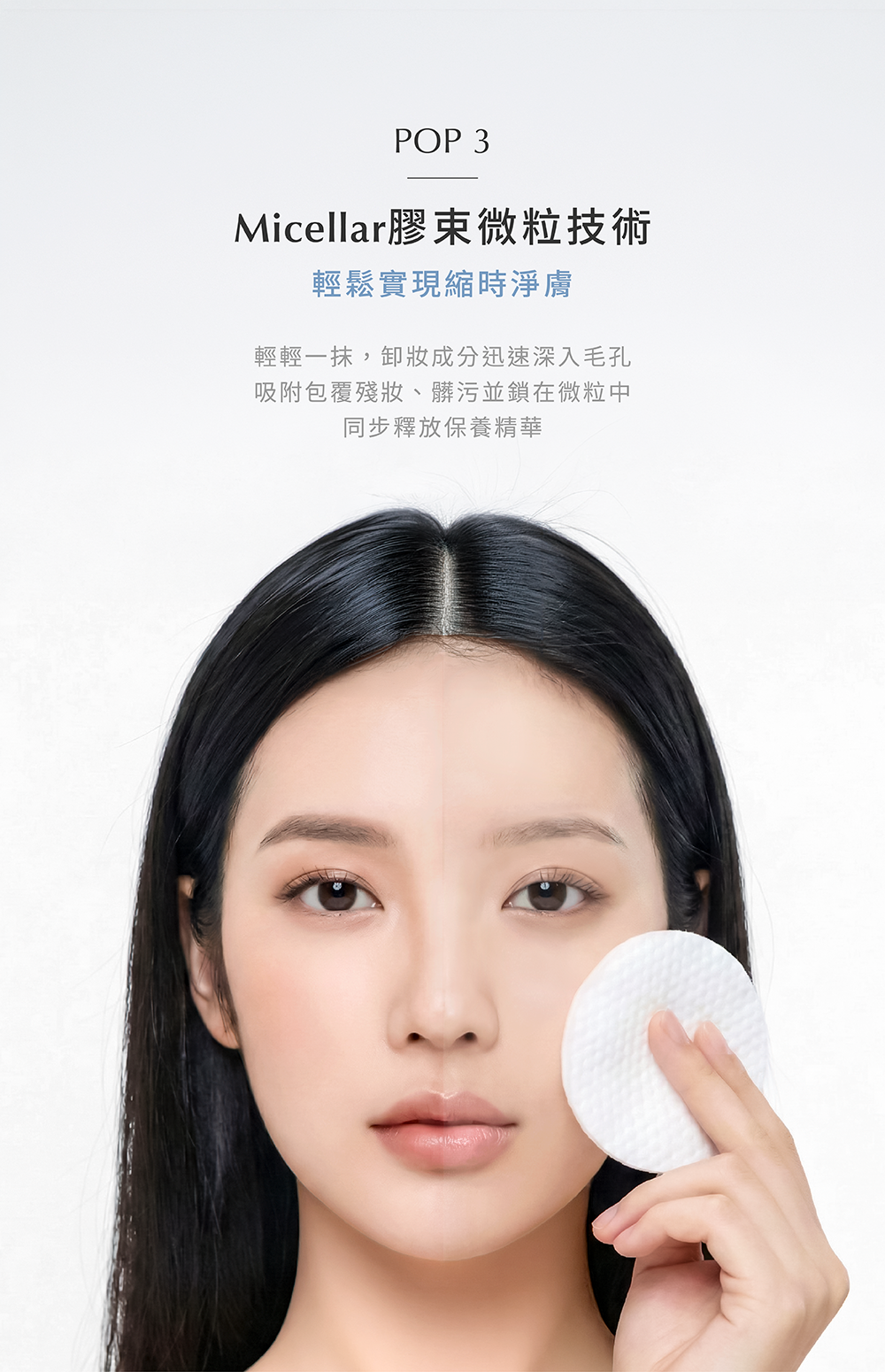 2.立體面:輕柔擦拭全臉,卸除臉部彩妝及髒汙。